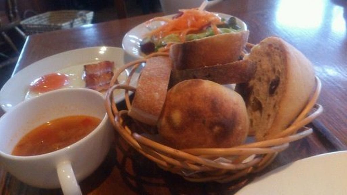 - ベーカリープレート 1320円(パン盛り合わせ、サラダ、ベーコン、ドリンク等)