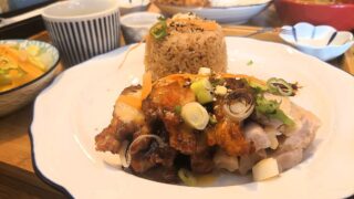 定食にはライス・スープ・小鉢・漬物・デザート付き