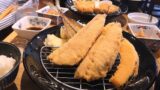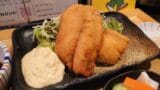 JR香椎駅からすぐのところにある「食堂 海トごはん」。朝仕入れた新鮮な鰺をフライにしたあじフライ、レアで仕上げています。定食には小鉢が2つ付いており、その1つが胡麻アジでした。アジフライは生で頂ける程新鮮な鰺を使用しサクサクでおいしい。天草の塩、手作りタルタルソース、ソースが添えてあります。